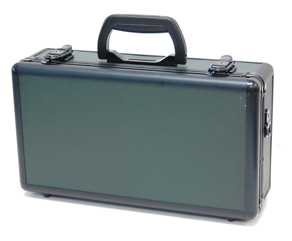 THE FRAME IS BLACK ALUMINUM AND THE SIDE PANELS ARE DURABLE ALUMINUM WITH A FINE TEXTURED FINISH. PANELS ARE A DARK FOREST GREEN. THE INTERIOR IS LINED IN A DENSE DARK FOAM FOR THE PROTECTION OF YOUR PRODUCTS. THIS CASE ALSO HAS FOUR FEET ON THE BOTTOM AND 4 FEET ON THE BOTTOM SIDE FOR WHEN THE CASE IS OPENED AND LAID ON ITS SIDE.