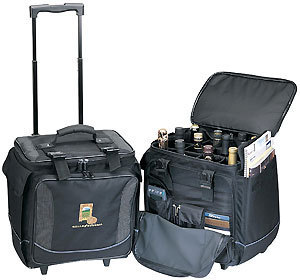 This is a Twelve (12) bottle wine carrier with telescoping handle, two poly wheels, insulated case and zipper access top.