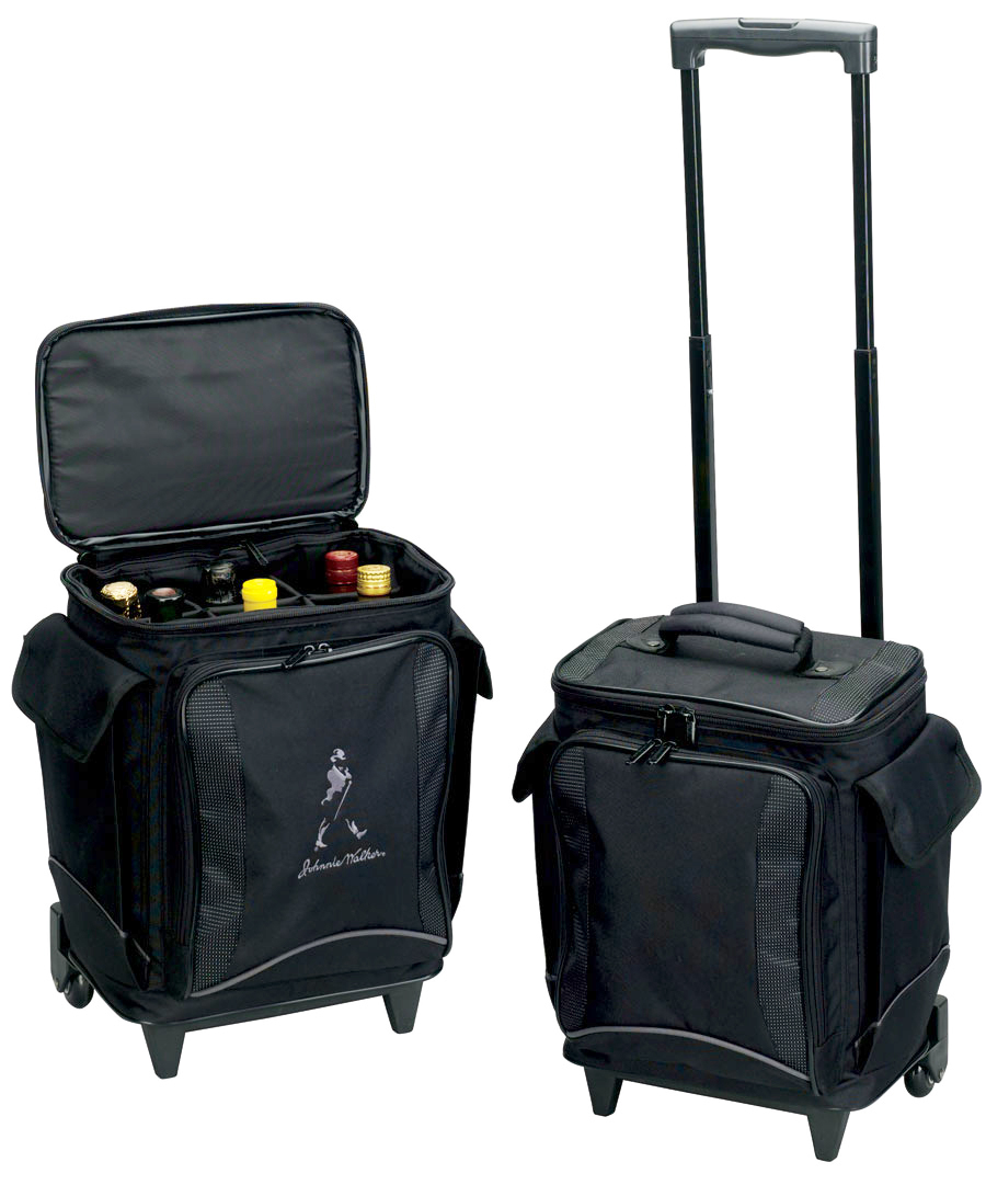 Features include 6 separate padded compartments for bottles, a zip compartment in front containing pockets for a PDA, phone, cards, pens, keys & memory stick, dual pockets on the side and wheels that allow it to roll effortlessly in transit.