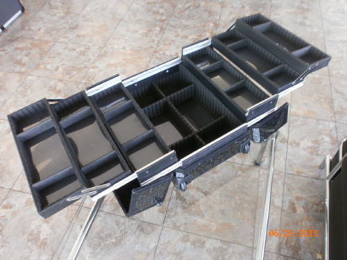 THE TOP IS HINGED AND SPLITS IN HALF TO OPEN AND ALLOWING TWO 3 TIERED TRAYS TO EXTEND TO THE LEFT AND RIGHT SIDES OF THE OPEN CASE. PIANO HINGES INSURE THAT THE CASE HALVES OPEN AND WORK SMOOTHLY.